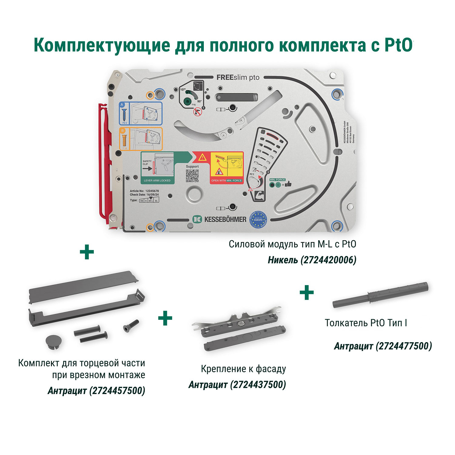 Полный комплект ультратонкого подъемного механизма ФриСлим ФЛАП Kesseböhmer c толкателем PTO тип I для врезного монтажа, цвет АНТРАЦИТ
