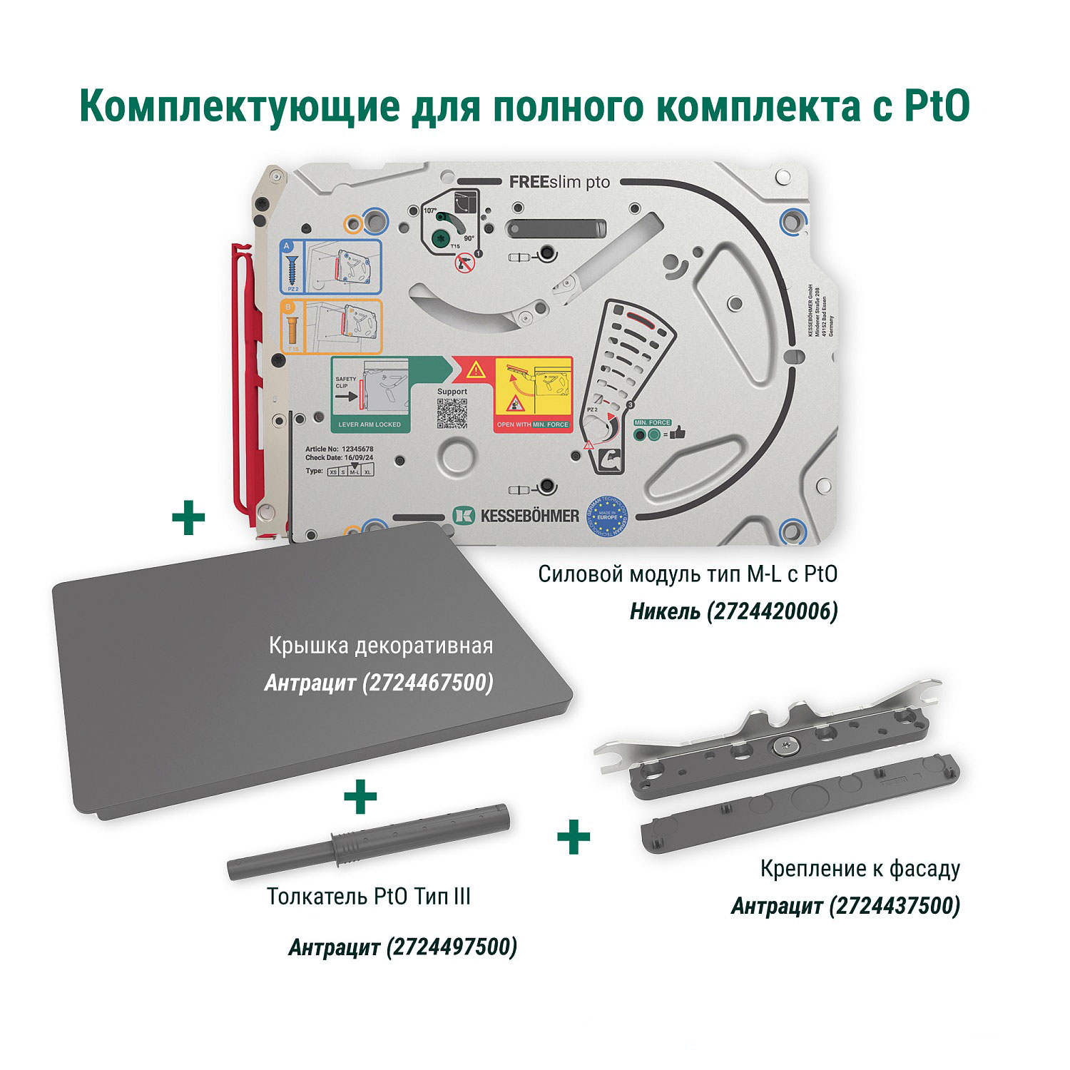 Полный комплект ультратонкого подъемного механизма ФриСлим ФЛАП Kesseböhmer c толкателем PTO тип III для накладного монтажа, цвет АНТРАЦИТ